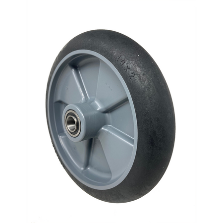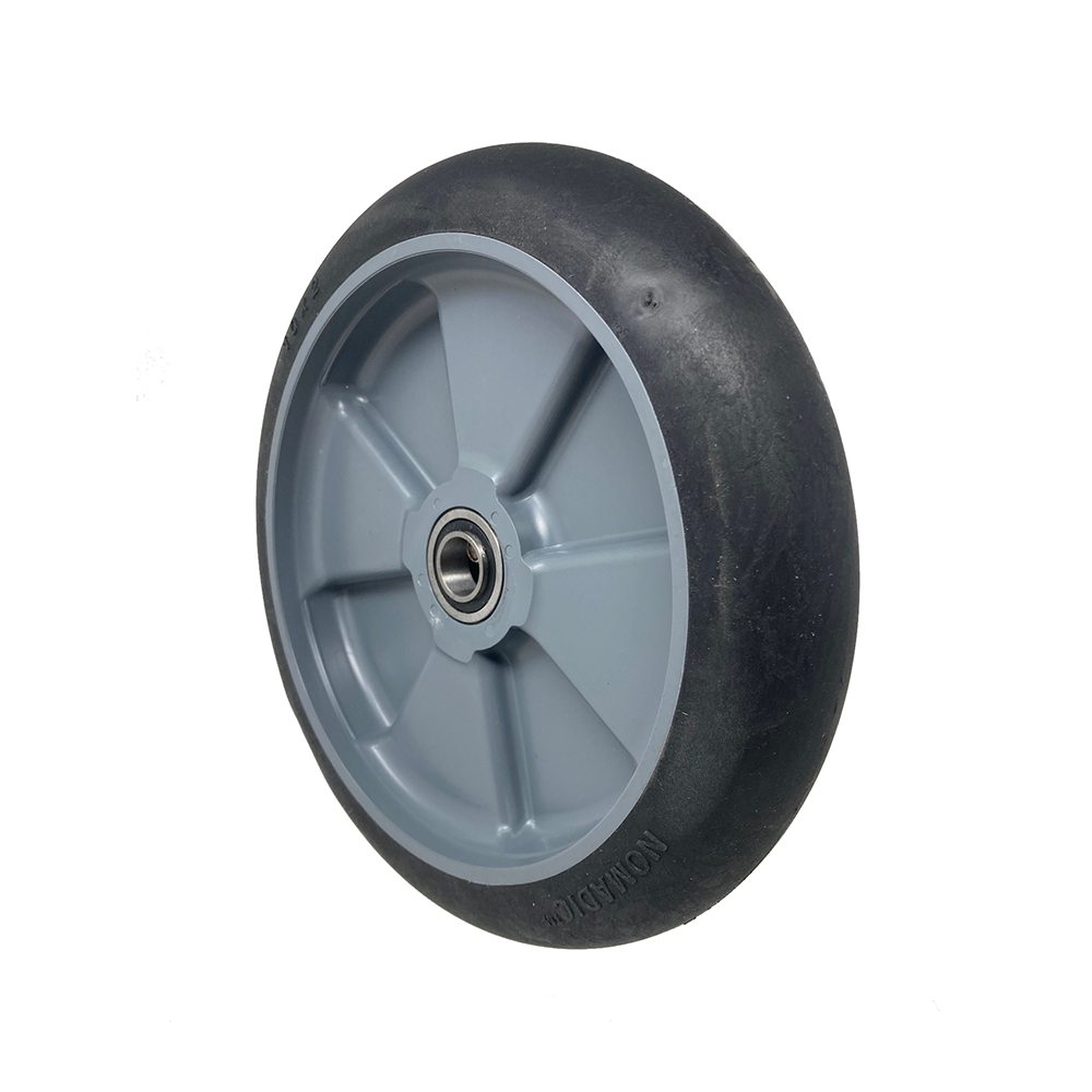 The Nomadic wheel is quiet rolling, provides a cushioned ride, and is impact-resistant, making it a great wheel for carts that carry sensitive cargo. With a flat tread, this wheel works well on hard floors, and the high-performance thermo-elastomer tread works great over bumps and thresholds.