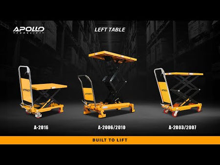 These lift tables are equipped with dual scissor mechanisms, making them versatile for various industrial and commercial applications. The handle height is 36" when upright and cannot be folded down, providing a sturdy and ergonomic control point.