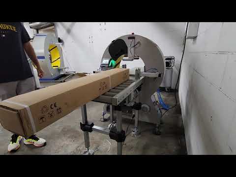 Automatic orbital wrapper used for bundling product with stretch film. Also known as a horizontal stretch wrapper, this machine is ideal for warehouse and manufacturing use. It automatically loads products and threads, wraps, and cuts stretch film. The model OWM-FA-50 is ideal for products like wood molding, flooring, profiles, aluminum bars, pipes, tubes, blinds, or any other small product needing to be bundled.
