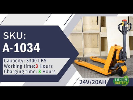 The Lithium Full Electric Pallet Jack is designed for efficient powered navigation, making it ideal for urban deliveries, small markets, and limited stock spaces. With a load capacity of 3300 lbs, this hydraulic pallet truck offers reliable functionality and ease of use.