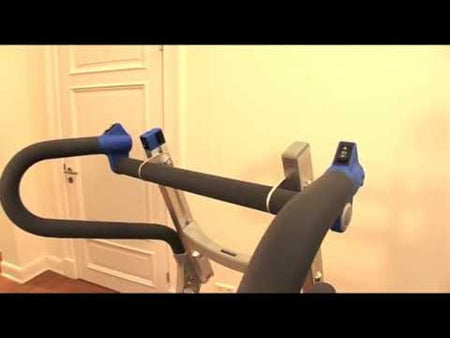 This truck is equipped with an innovative edge-of-step braking system that automatically engages when the wheels reach the edge of a step, preventing accidental rolling and ensuring load control. The brake can be deactivated for use on level ground, preventing unwanted braking on uneven surfaces. It operates in two modes: single step, where the ascend or descend button must be pressed after each step for maximum control, and continuous climb.