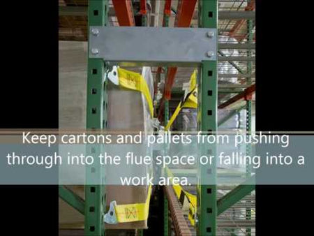 Rack Safety Straps are mounted to the back of the rack and act as a barrier to keep large, palletized, or shrink-wrapped items from pushing through into the flue space or falling into a work area.