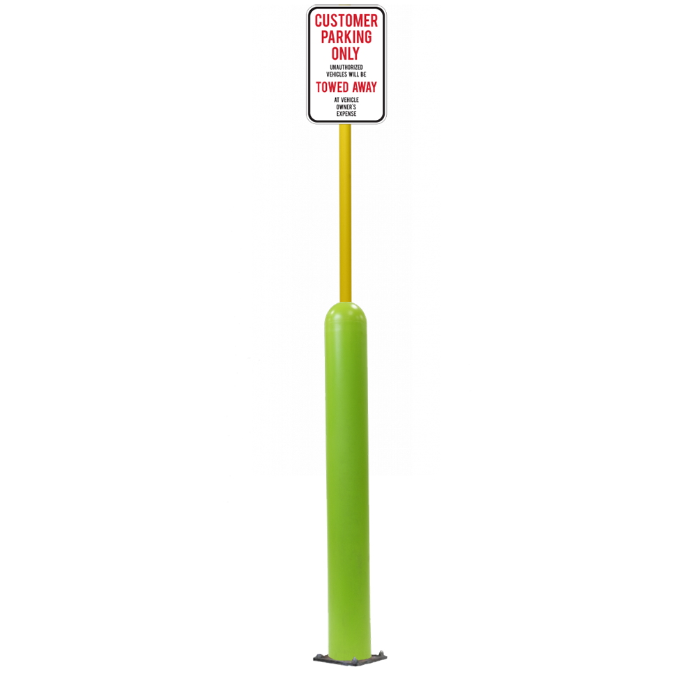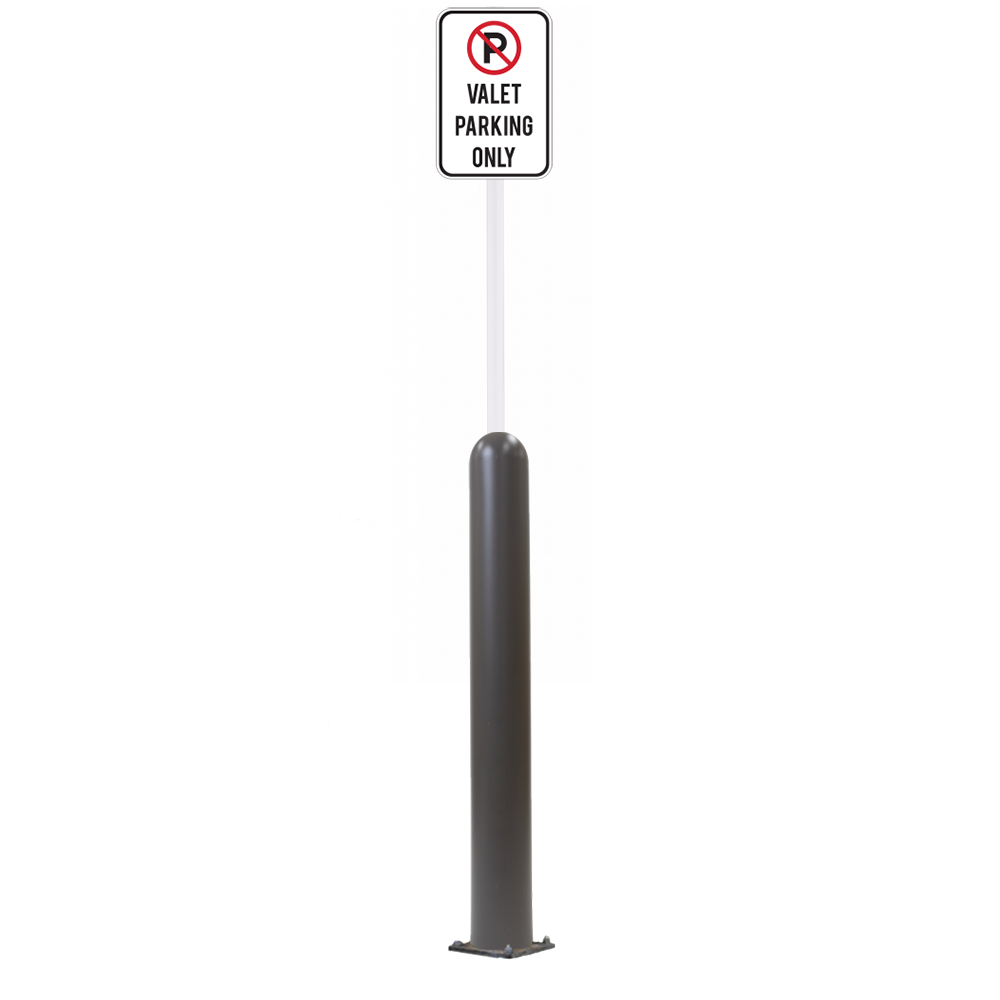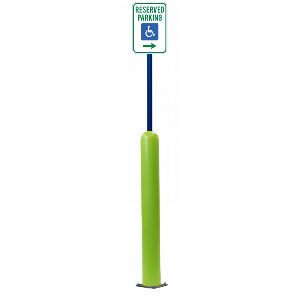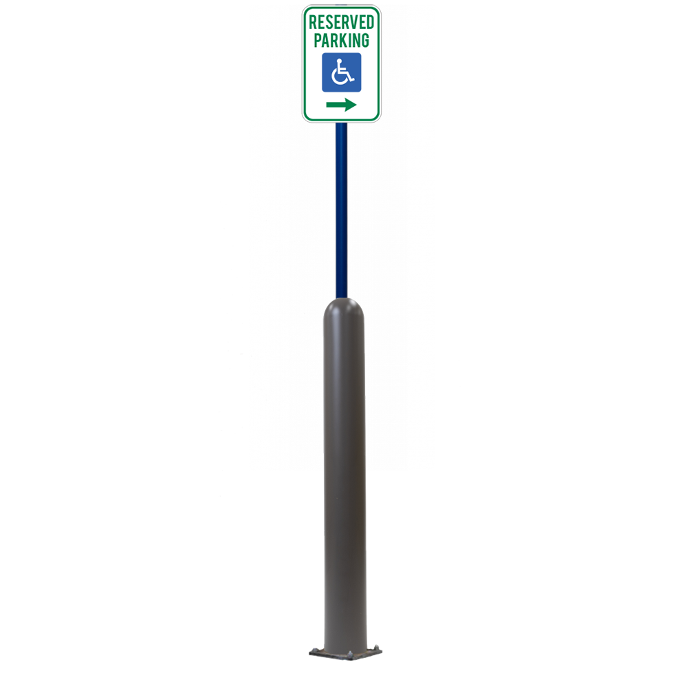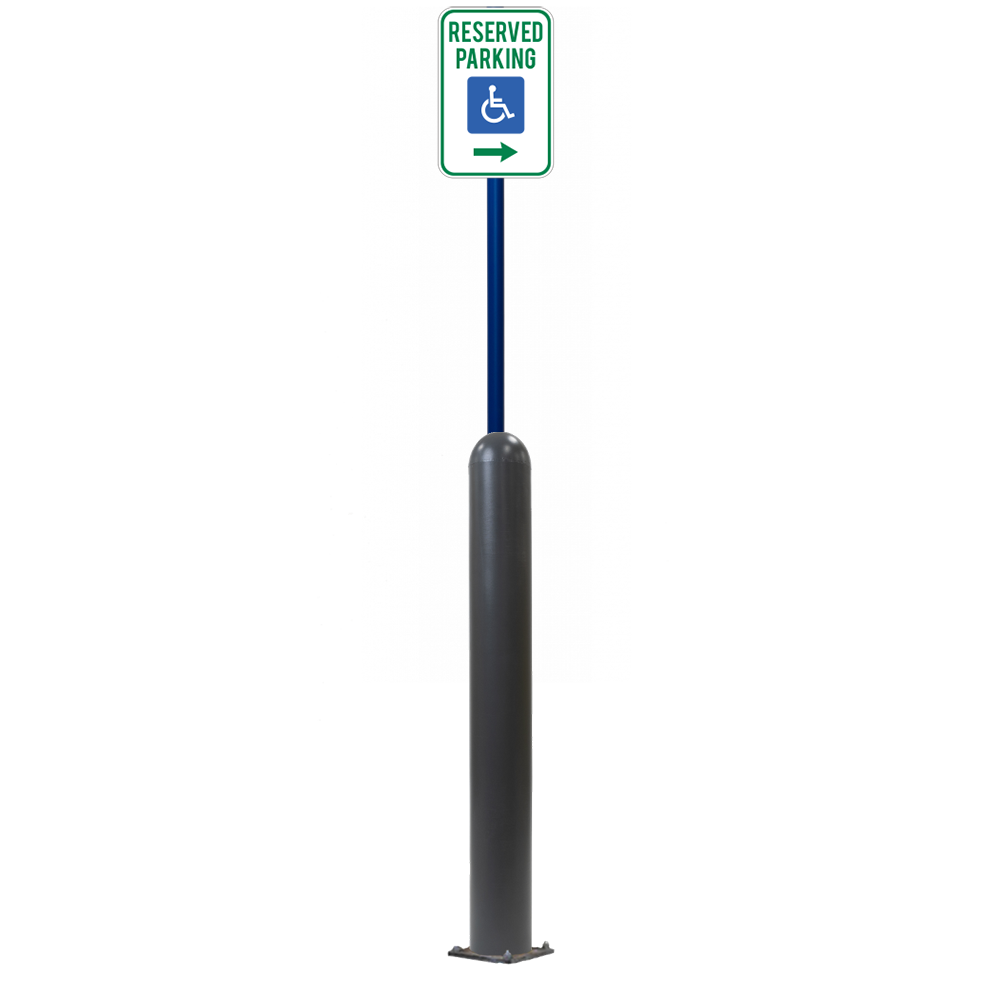 Our Bollard Sign Systems are steel pipe bollard sign post systems that are sleeved in a Bollard Cover and fabricated to include a steel signpost. The full sign system is a great alternative to regular steel parking lot signs which require constant paint jobs and repairs.