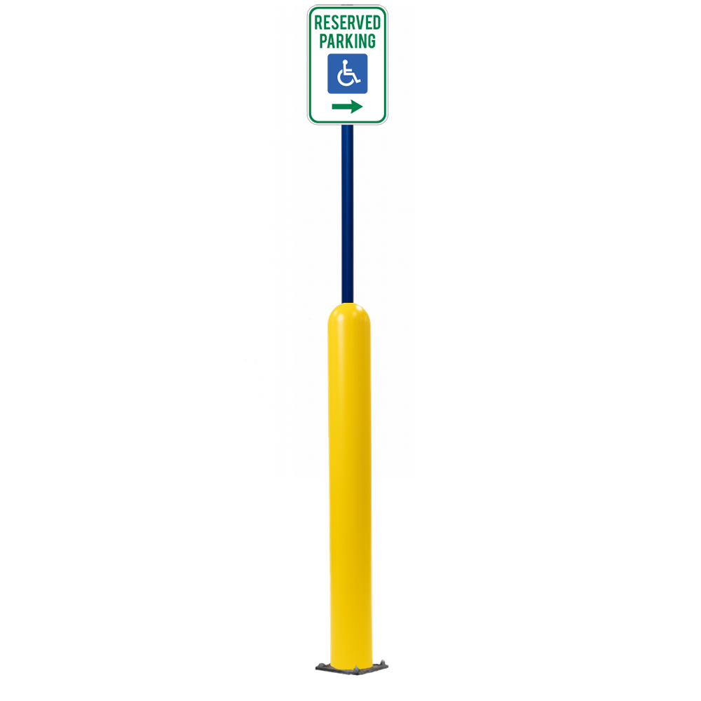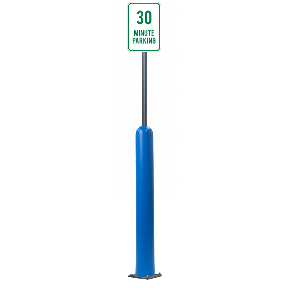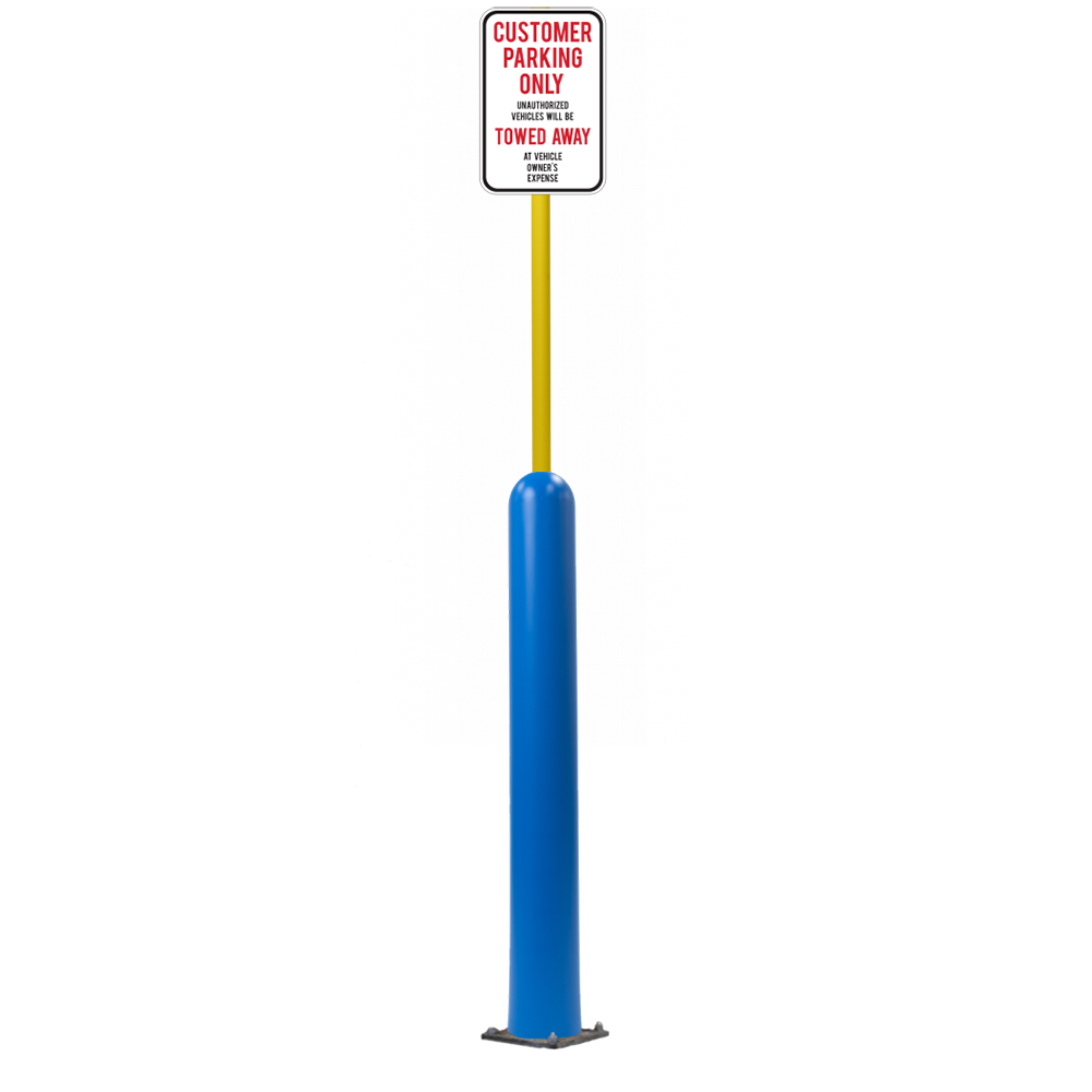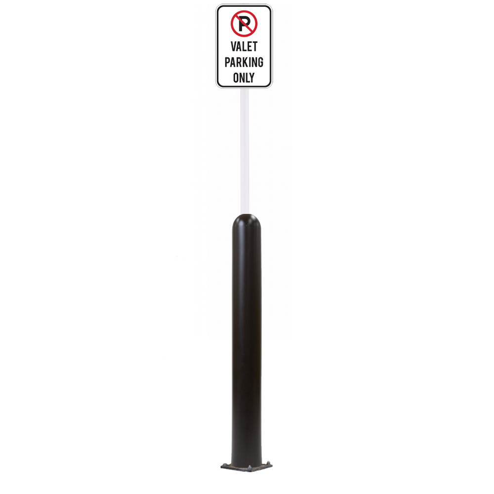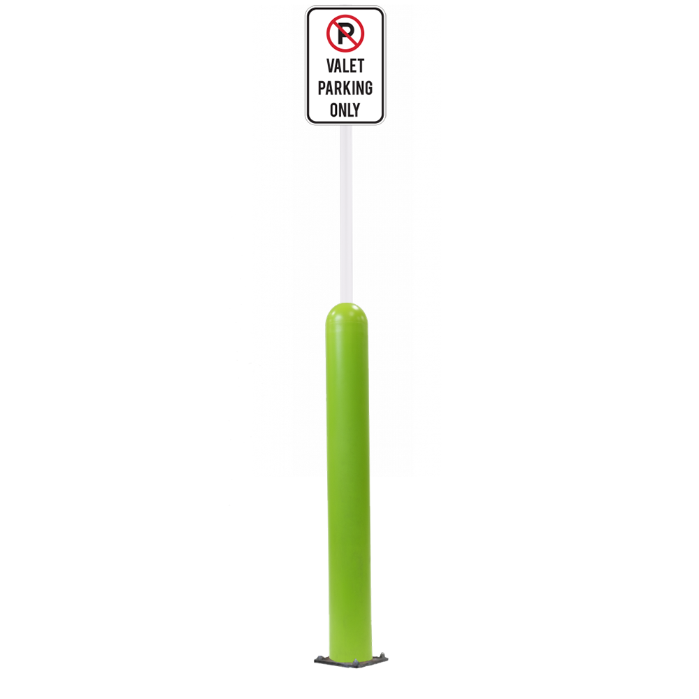 Our Bollard Sign Systems are steel pipe bollard sign post systems that are sleeved in a Bollard Cover and fabricated to include a steel signpost. The full sign system is a great alternative to regular steel parking lot signs which require constant paint jobs and repairs.