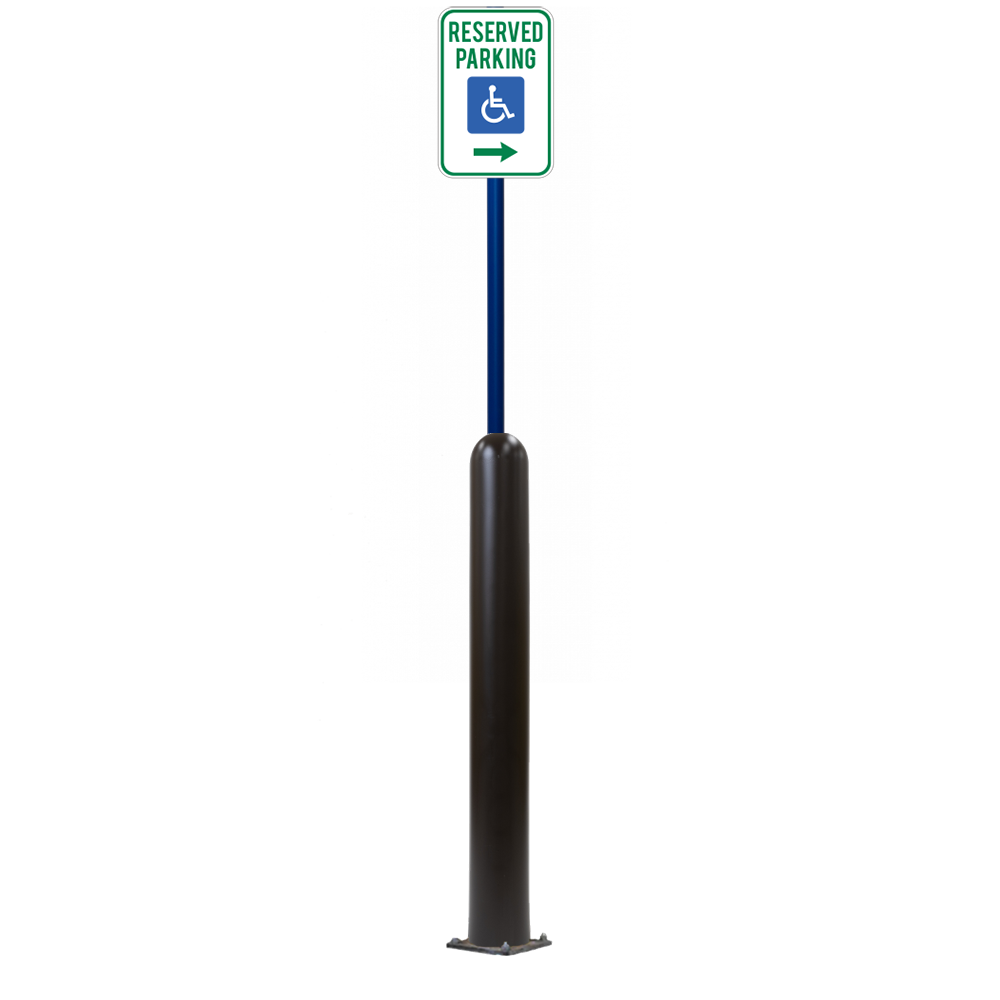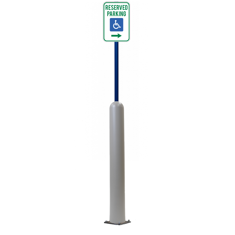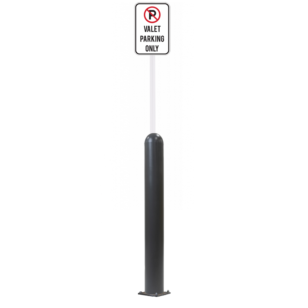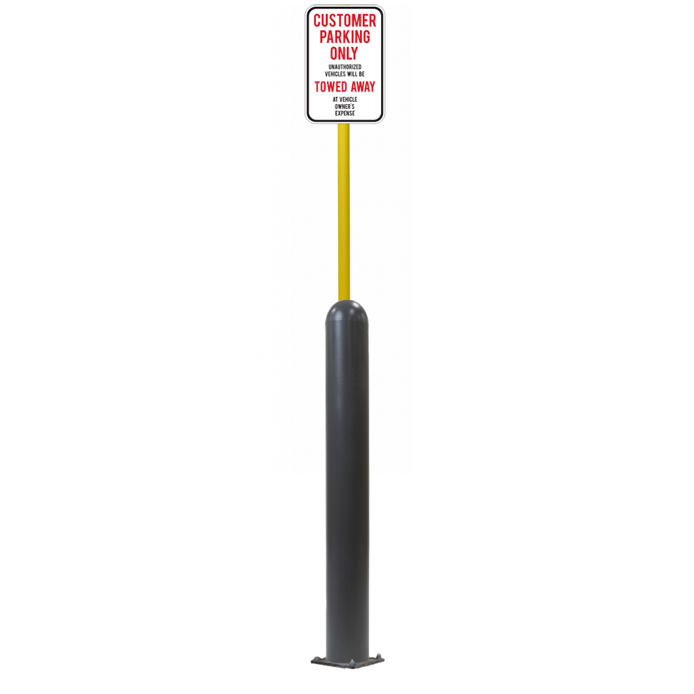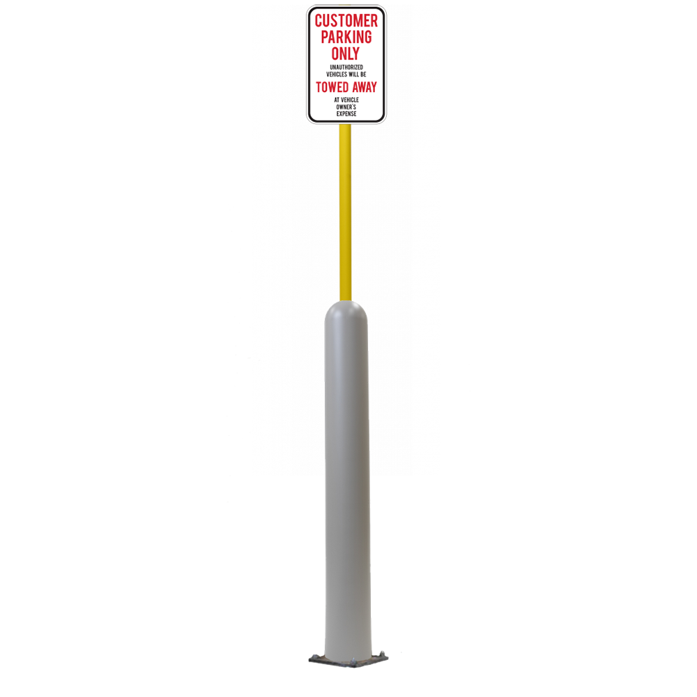 Bollard Sign Systems are steel pipe bollard sign post systems that are sleeved in a Bollard Cover and fabricated to include a steel signpost. The full sign system is a great alternative to regular steel parking lot signs which require constant paint jobs and repairs.
