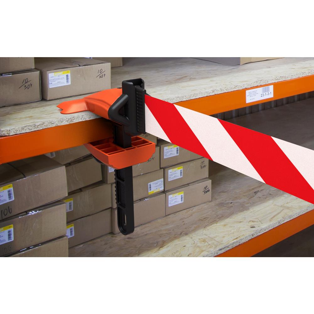 The clamp holder/receiver is used to attach the Skipper XS Unit and/or tape end to angular surfaces such as door frames, work surfaces and racking. Simply position the clamp in place and turn the screw to tighten. The clamp holder/receiver can be positioned either horizontally or vertically depending on the desired application.