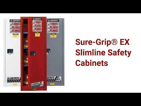 Justrite blue steel Slimline safety cabinets for corrosives have the same quality safety features as the cabinets for flammables. All models come with double-wall construction, dual vents, grounding wire connections, adjustable shelves, leakproof sills, three-point self-latching doors, and leveling feet. Self-close door(s) shuts and latches automatically when a fusible link melts at 165°F (74°C) under fire conditions. Unique, concealed self-closing mechanism offers obstruction-free access to contents.