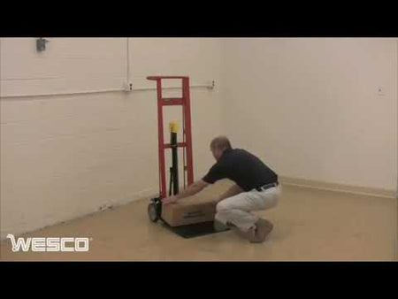 The Wesco Two-Wheeled Hydraulic Pedalift is engineered for high-efficiency and safe material handling. This robust unit features a 22" x 22" platform and a front tip of the nose plate that touches the floor for easy loading. A foot-operated hydraulic pump allows for raising the platform effortlessly, while a foot release smoothly lowers it.