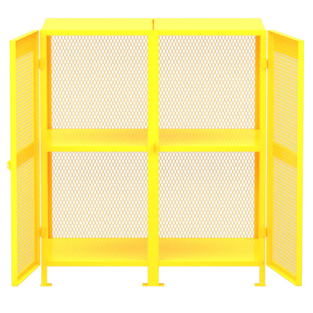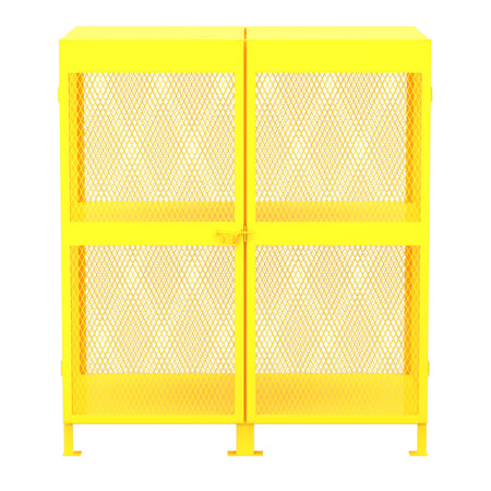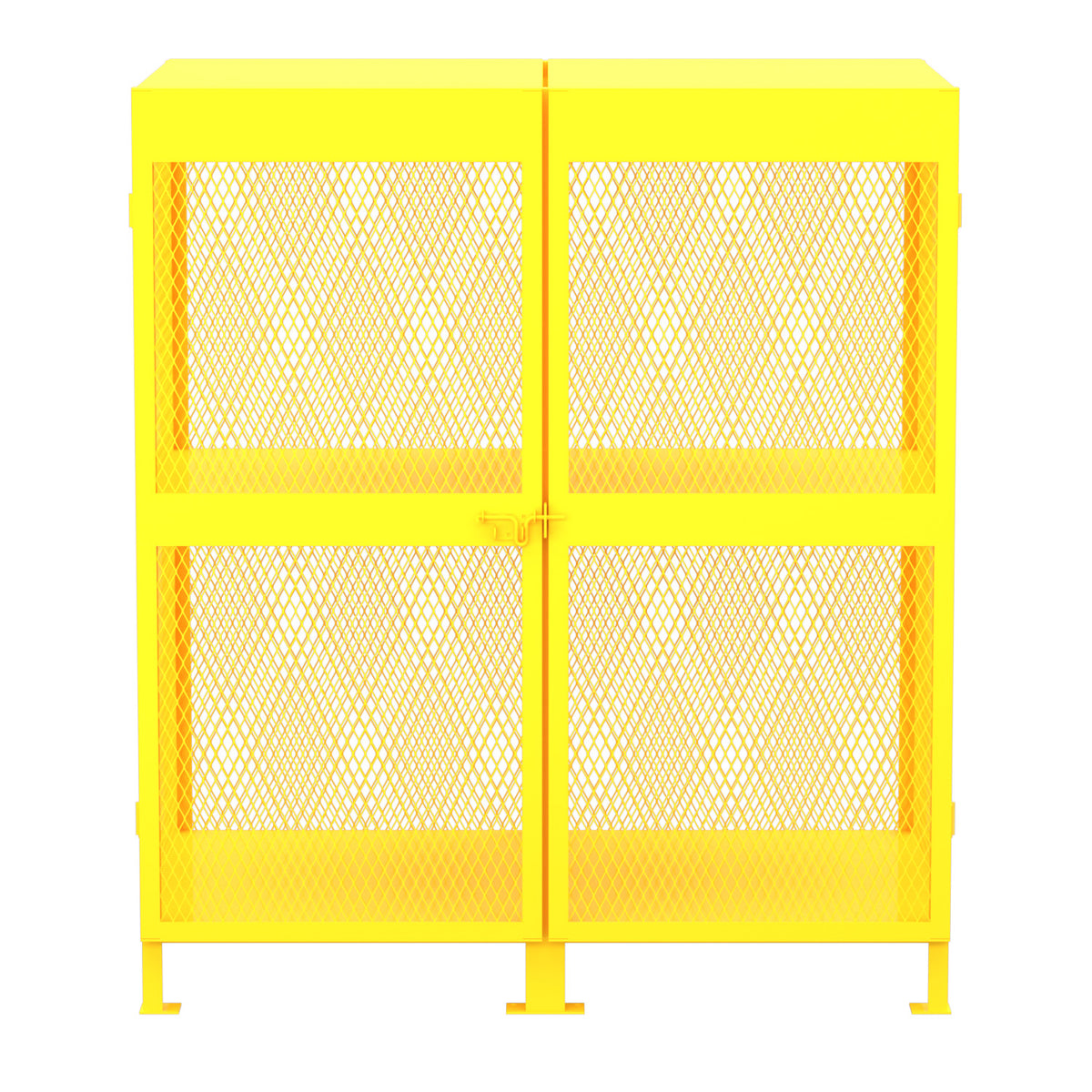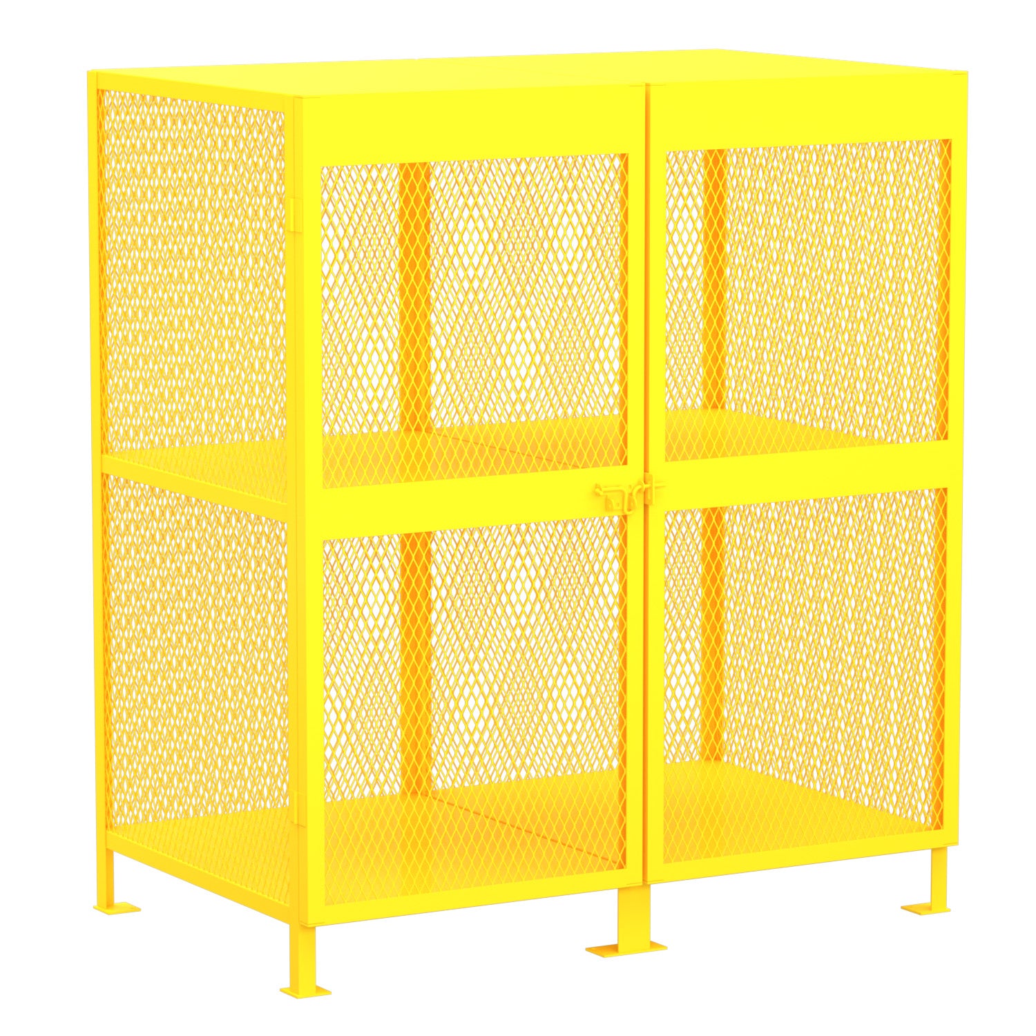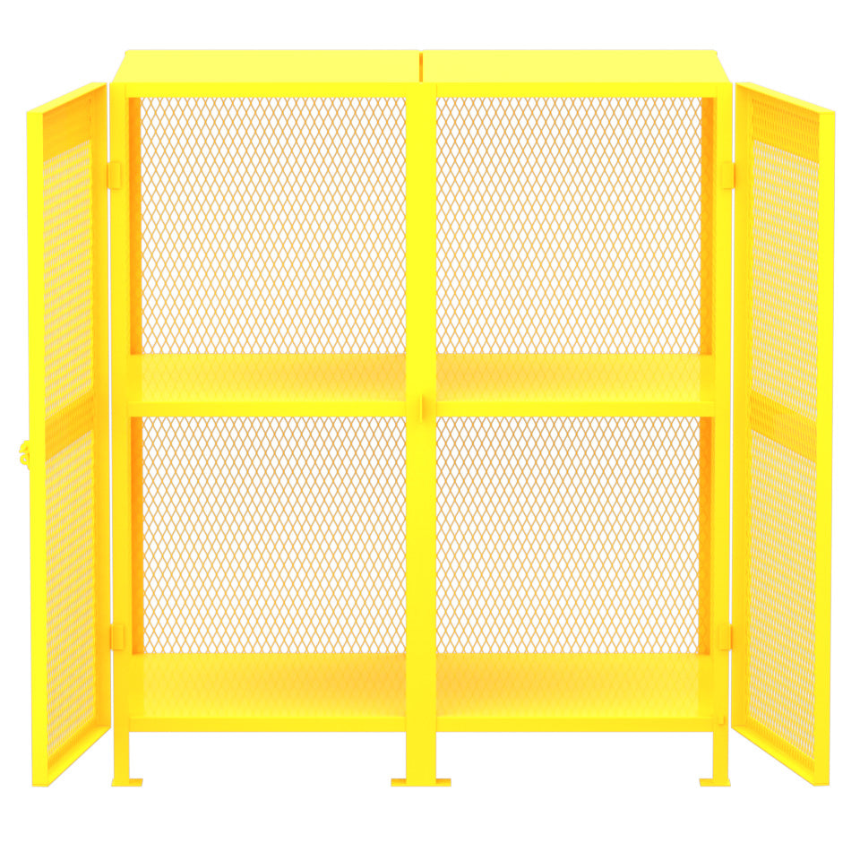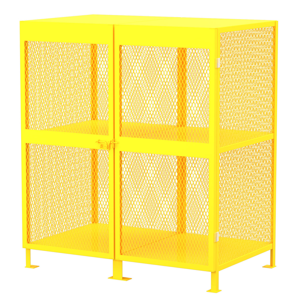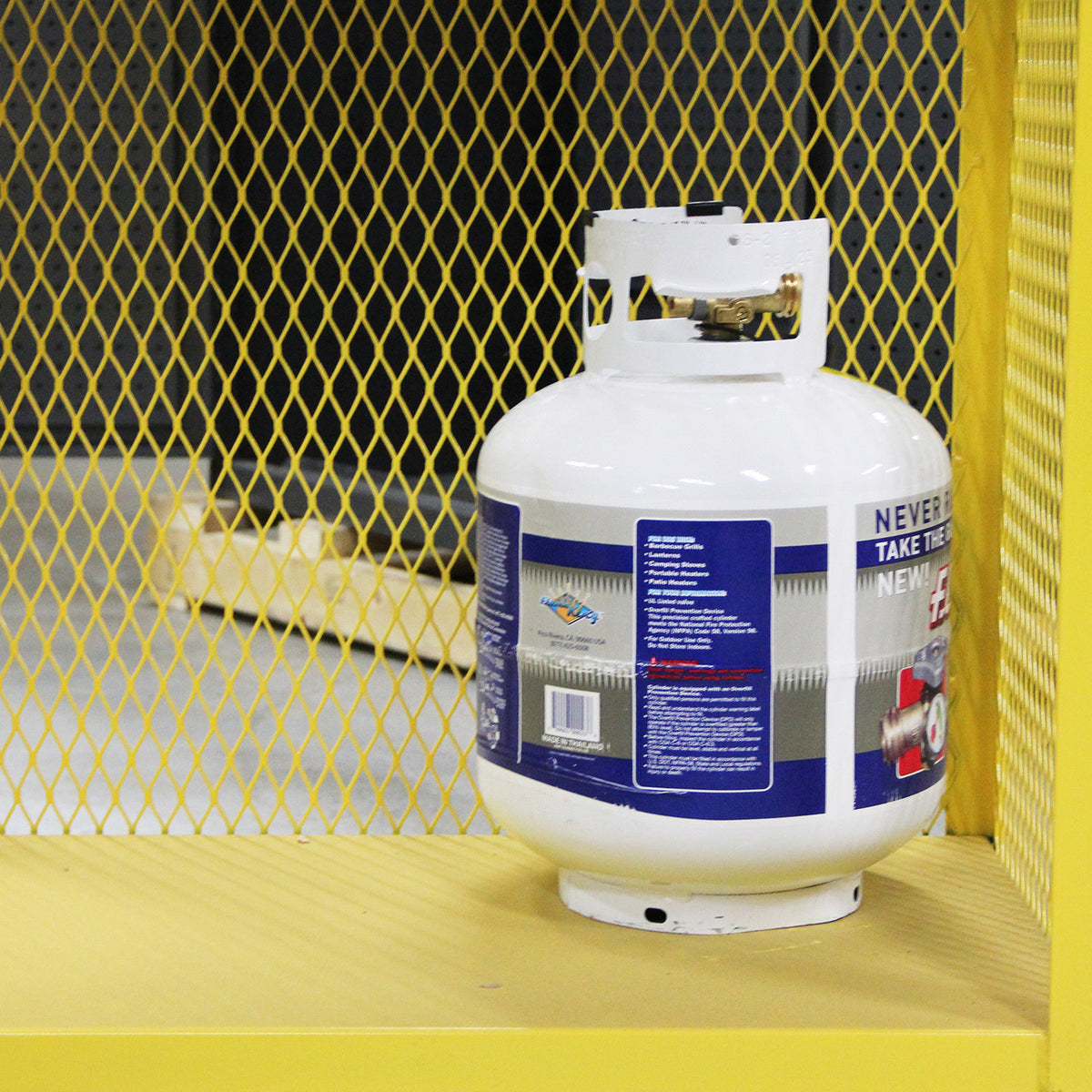 This rugged cabinet has 2 welded shelves and stores up to 16 gas cylinders. Storage is compatible with 20, 33, and 40 lb. cylinders. Premium welds improve the structural durability, making your unit last for years to come. The steel mesh provides security while also offering ventilation and visibility to inventory. Easily keep unit secure using the padlockable hasp. High-vis flammable warning sign included.