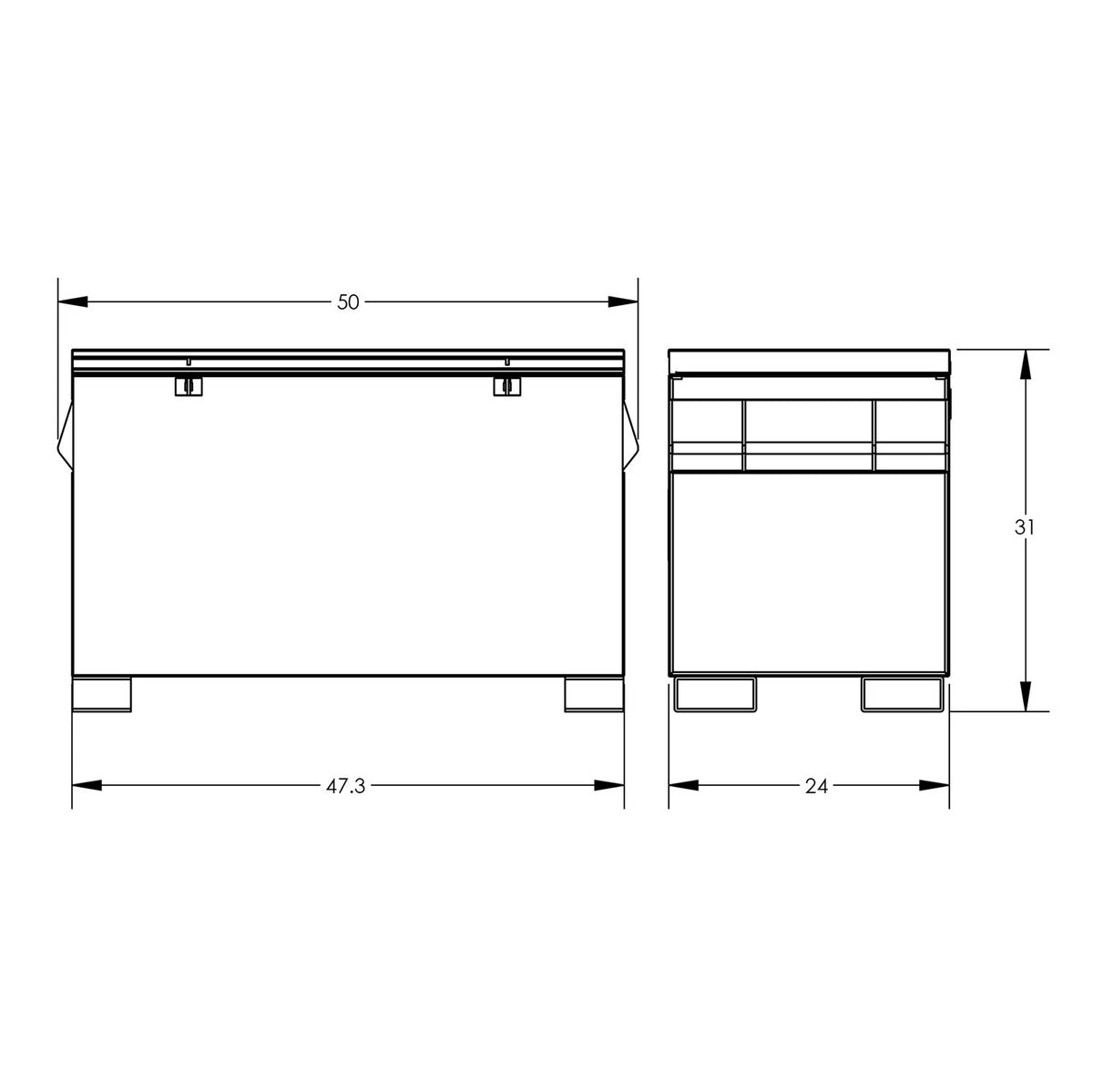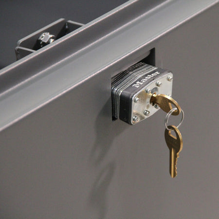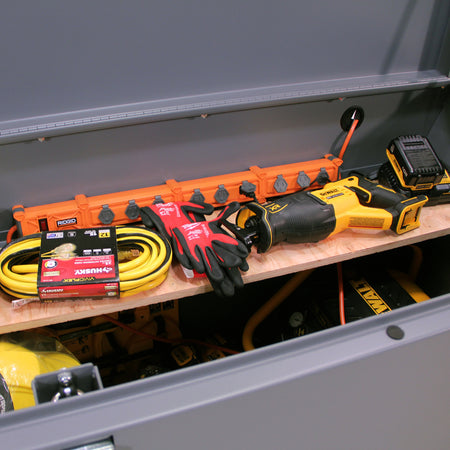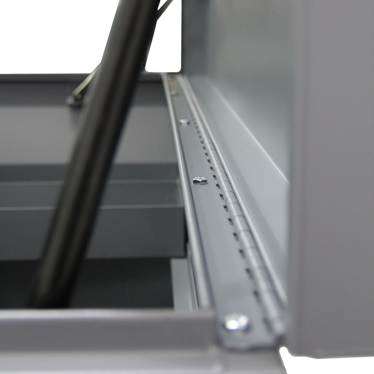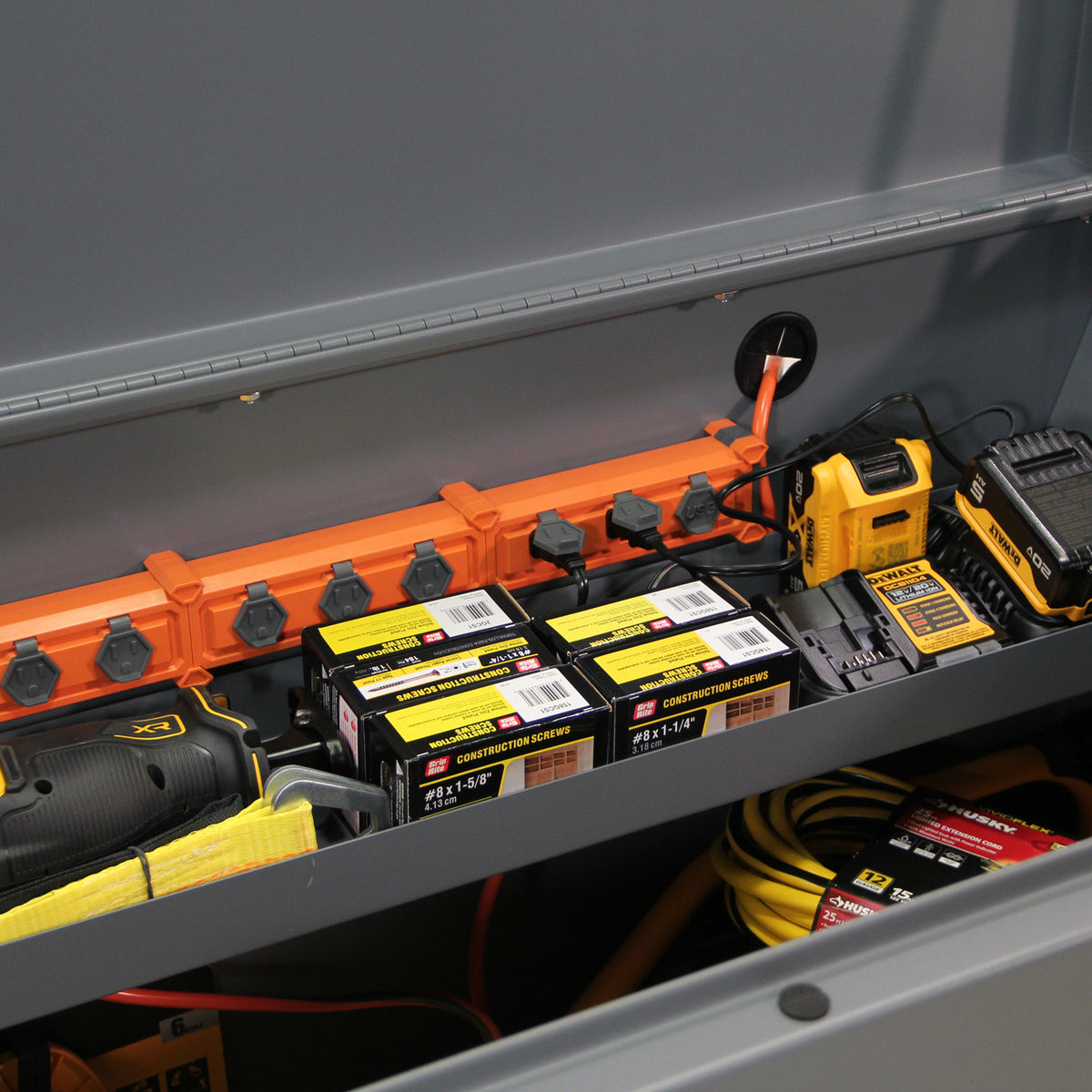 2 Recessed padlock enclosures provide maximum security and deter theft (compatible with Master Lock #5 or equivalent). A premium full-length piano hinge ensures stability, durability, and long life. A rear rubber grommet offers power cord access, allowing tools to be charged while keeping the chest securely closed. The lid features 2 support struts: 1 gas-assisted for effortless lifting, and 1 mechanical to hold the lid open as needed.