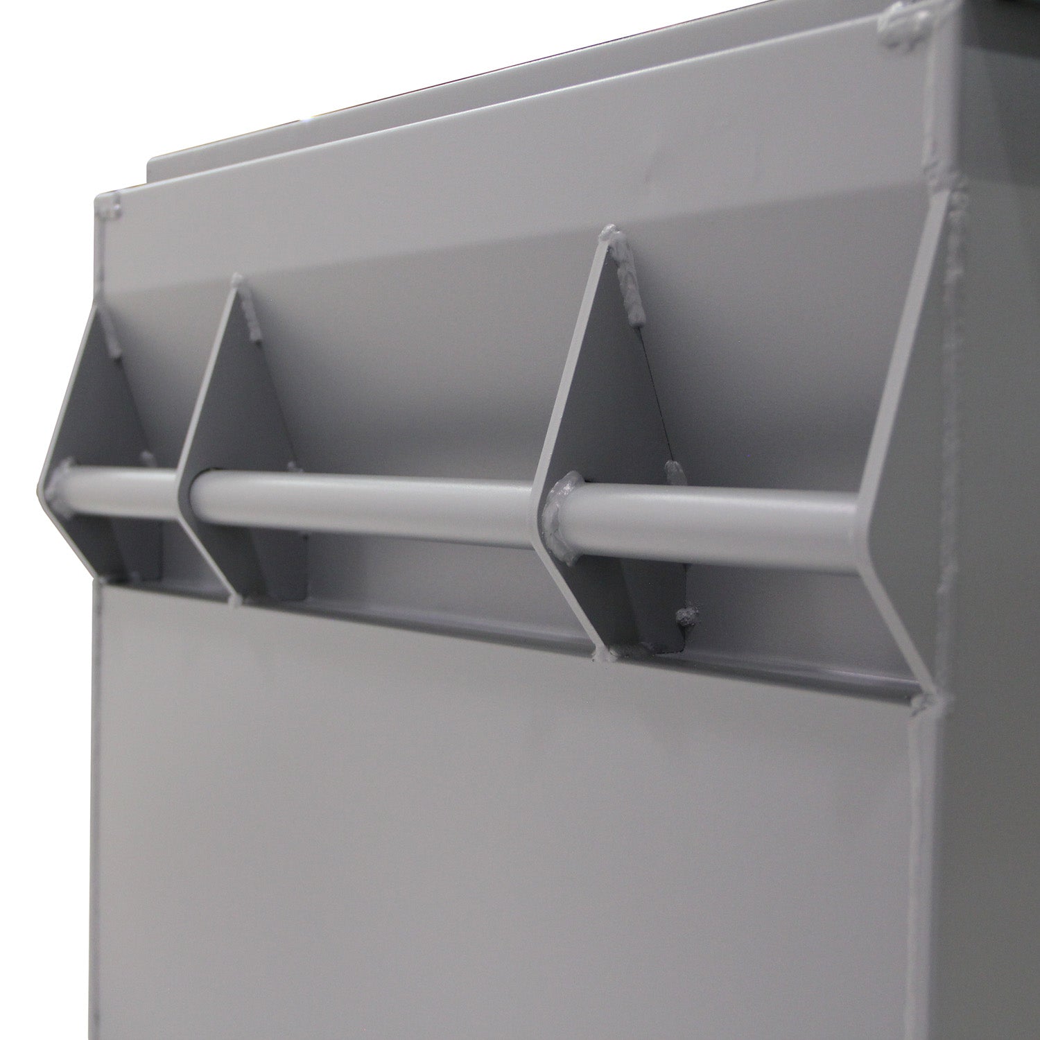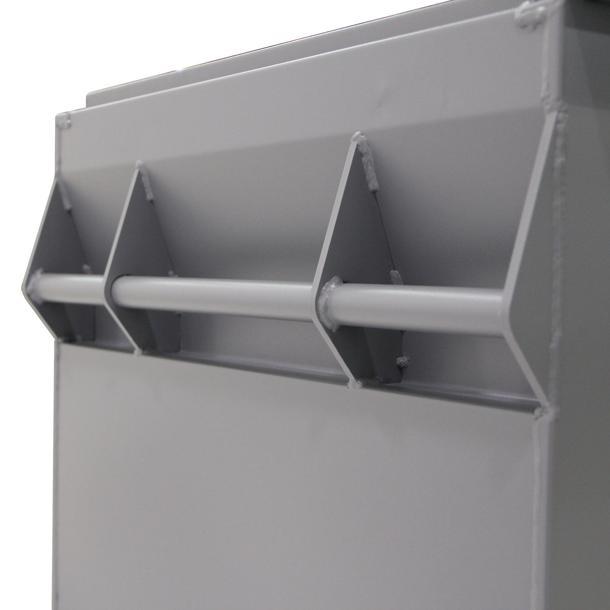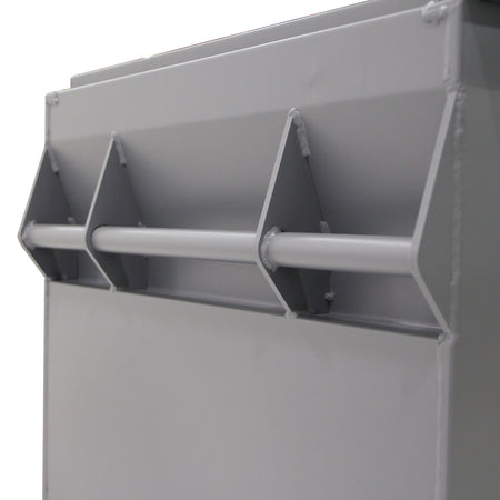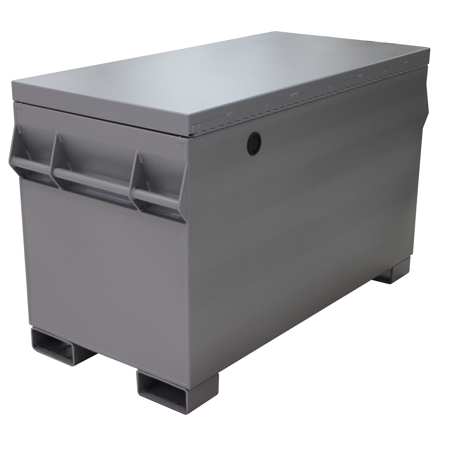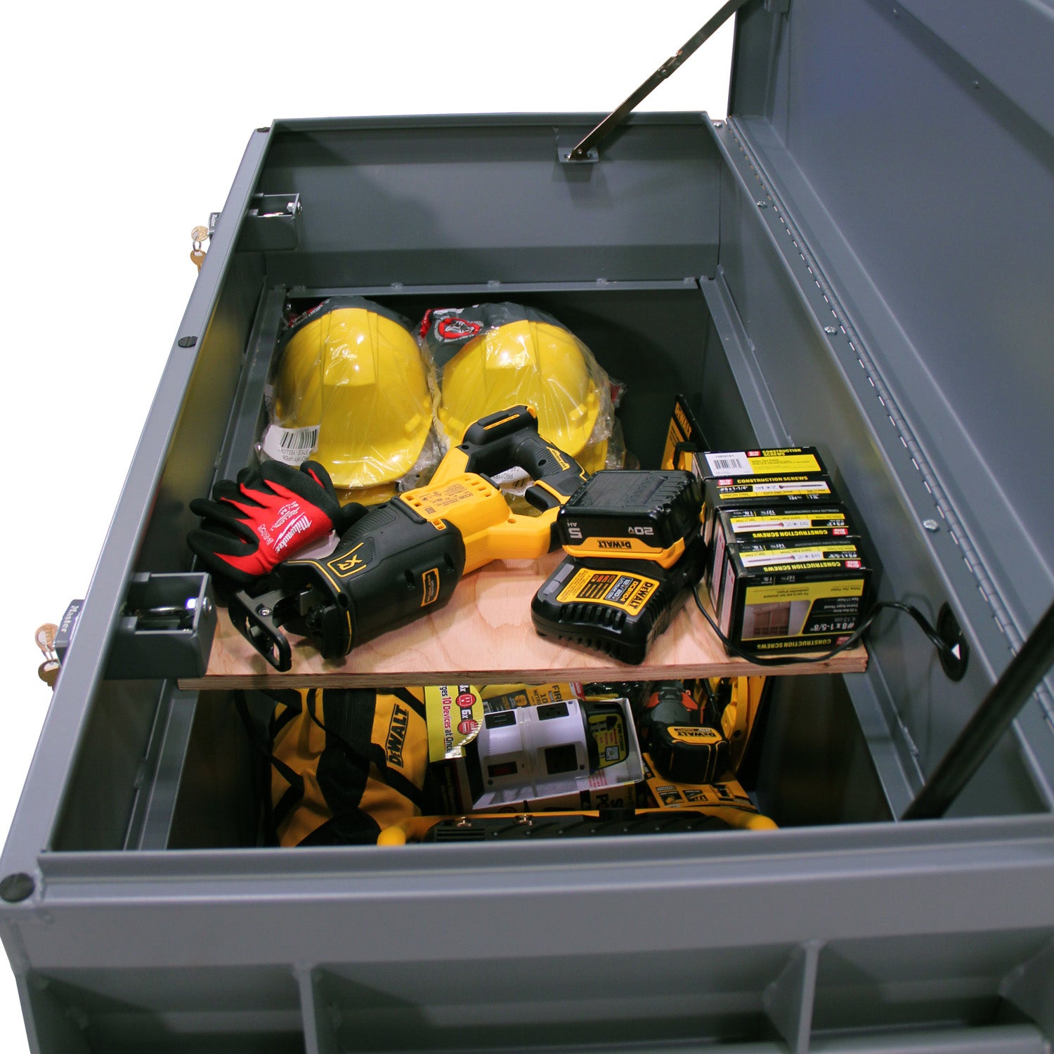 An upper support rail system along the interior perimeter accommodates shelves and trays for smaller items. Use with steel accessory trays (sold separately) or with your own materials. Commonly used with jobsite plywood to create custom shelves horizontally or vertically. Equipped with handles on both sides, the jobsite box can be easily moved by hand or transported using the 4-way forklift design with built-in fork pockets. For overhead lifting, simply attach hoist straps of chains to the outside divider sections of the welded side handles.